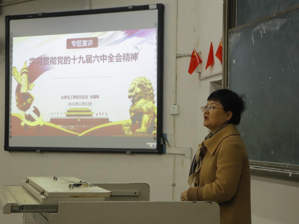 为深入学习贯彻党的第十九届六中全会精神和省十一届十次全会精神,2021年12月22日下午17:10,化学公司党总支书记朱朝菊在一教楼100教室作“党的第十九届六中全会精神”专题宣讲,公司全体教职工和部分员工党员参加此次宣讲会议。