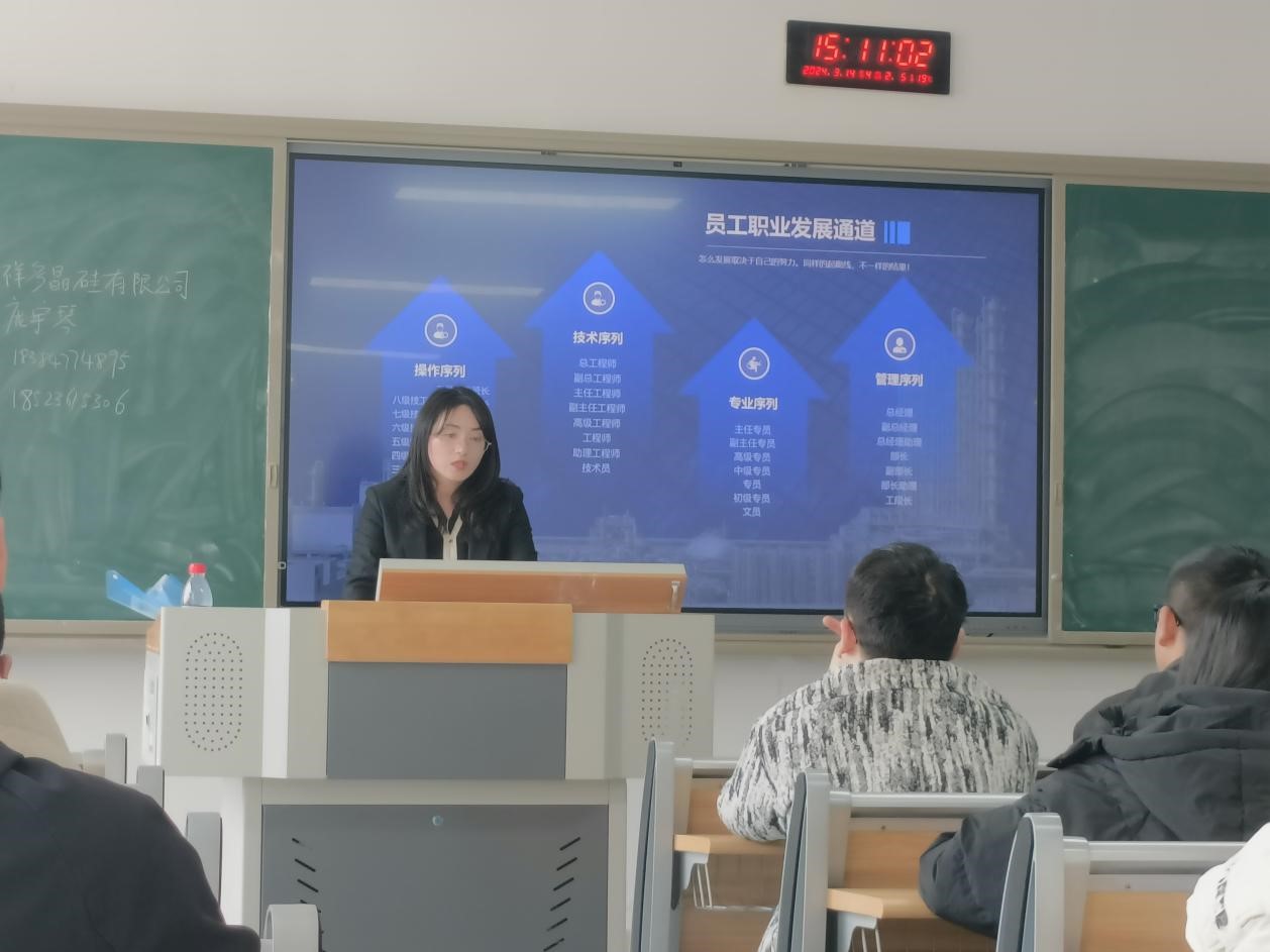招聘会伊始,招聘经理庞宇琴以视频的形式展示了高纯晶硅的生产过程,并结合PPT向毕业生们介绍了公司培养新人的成长路径图、公司的发展前景等。随后,招聘经理庞宇琴向毕业生们播放了该公司的“朝阳计划”集训视频,同学们热情高涨。此次招聘主要针对应用化学和化学工程与工艺专业。公司2019级优秀毕业生曾伟学长结合在该公司的成长经历为同学们答疑解惑,现场气氛和谐融洽。