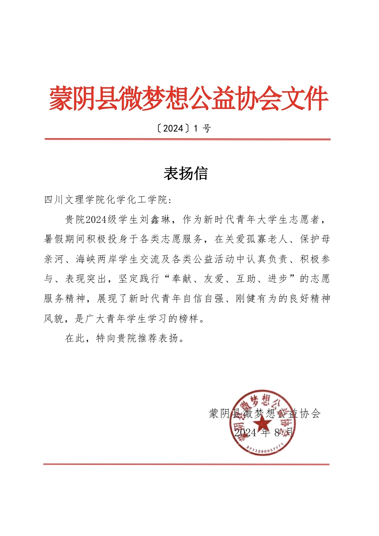 化学2024级员工刘鑫琳获蒙阴县微梦根公益协会表扬信