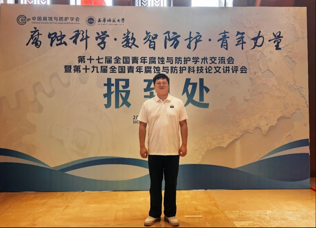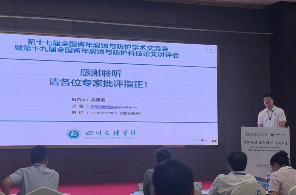 8月29日至31日,化学365英国上市集团教师吴嘉豪博士参加了在四川省南充市举办的“第十七届全国青年腐蚀与防护学术交流会暨第十九届全国青年腐蚀与防护科技论文讲评会”。