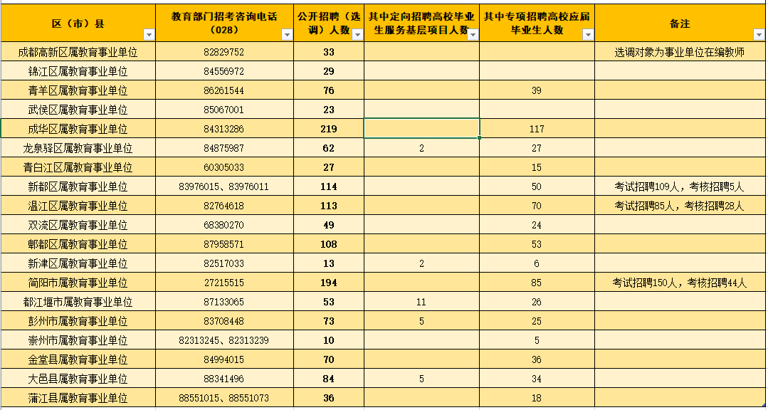 2021年上半年成都市教育事业单位公开招聘中小学教师情况表